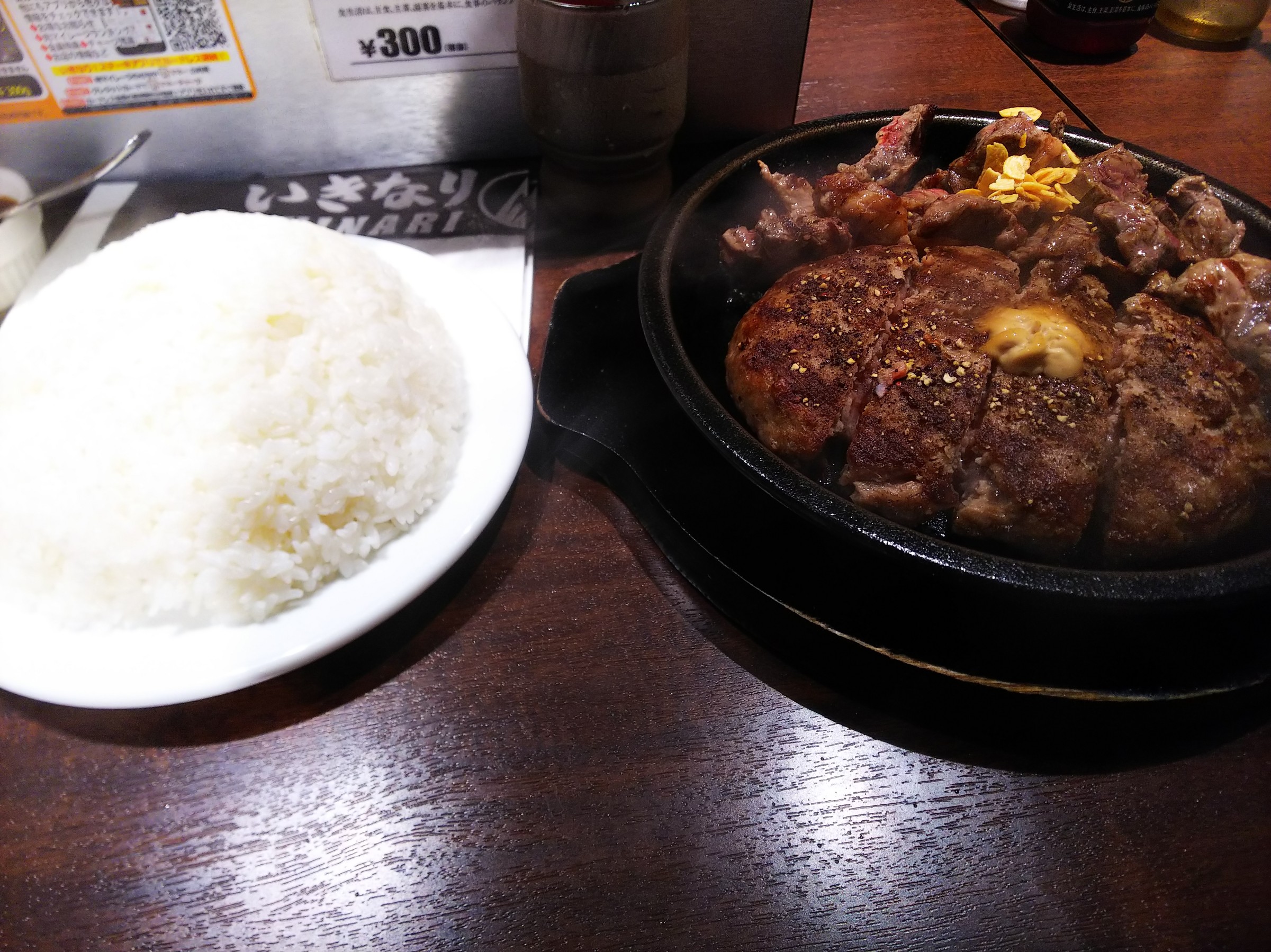 またもや、、、 ポスト 2018年5月2日 こんにちは、武内です。 またもやいきなりすてーきにいってきました! 今回は齊藤さんのおすすめで乱切り200gハンバーグ300gにしましたが量がえぐかったです(ToT) どうですか皆さん、、、(ToT) ご飯の量がやばいです。笑笑 合計ご飯900g 肉類500gでした。 さすがに歩くのが一苦労でした(ToT) 担当:武内