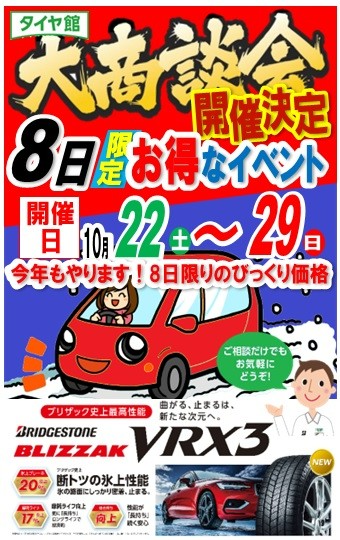 冬の大商談会 開催いたします!! ポスト 2023年8月14日 こんにちは、いつもご覧頂きありがとうございます(^^♪ 小牧市国道155号線沿いにありますタイヤ館小牧です♪ 今年もやります!!!!!! 冬の大商談会!!!!!! 期間は・・・・・ 10月21日 より 10月29日 まで・・・ 8日間です。 ブリザックスタッドレスタイヤ・・ 新車に乗り換えた・違う車種に乗り換えた方など・・・ スタッドレスタイヤの購入を 検討されている方・・ この機会に・・!! 担当:タイヤ館小牧