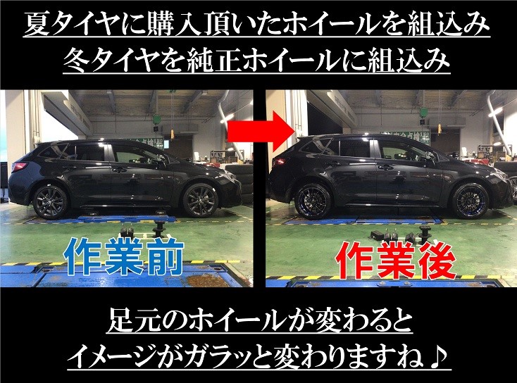 ★トヨタ カローラツーリング 3BA-ZRE212W 新品ホイール 冬タイヤ VRX2 相互入替 ポスト 2021年3月13日 加賀市、能美市、小松市のみなさま お世話になっております! タイヤ館コマツです♪ 本日、ご紹介の作業は トヨタ カローラツーリング 冬タイヤ/ホイール 相互入替 いつも当店をご利用頂いてる お客様よりご相談頂けました。 クルマを買い替えしたので 冬タイヤ/ホイールセットの 新調を検討してました。 いつもの行きつけの タイヤ館さんで お願いすることにしました♪ とのことで ご相談頂けました♪ ありがたきお言葉ありがとうございます まずはホイールの選定 かっこよくて しかも ブルーのワンポイントがある ホイールを探してます との リクエストで選ばれた ホイールはこちら ウェッズ スポーツSA72R 17x75 4/100 +48 色:BLC2(ブルーライトクロームⅡ) 鋳造/軽量タイプです♪ お次は冬タイヤ選定です 前の車でも使ってて とてもよかった ブリザックで選びたいです♪ でも、予算は抑えたいんです とのことで 選ばれた冬タイヤ商品はコチラ ブリザック VRX2 215/45R17 2017製造 在庫処分価格 商品の詳細はコチラ イイ商品が、お手頃価格で手に入る 在庫処分価格 掘り出しもののお宝品です♪ 他エリア店舗の在庫照会リストより 探し出せました♪ ブリヂストンのスタッドレスタイヤは 経年劣化しにくく ゴムの柔らかさが長持ちするタイプ。 だから 2〜3年前製造セリアル 冬タイヤを 購入いただいても ちゃんと効きますから 安心です♪ 乾燥路、ウェット ベチャベチャ雪、ザクザク雪 フカフカ雪、凍結などの 冬のあらゆる路面で 安定した効きを発揮し しかも 【効きが長持ち】と【減り難くて長持ち】 ブリザック現行モデルです♪ 今回、冬タイヤはお持ち帰ります ピット入庫前準備 シートカバー、ハンドルカバー シフトノブカバーを かけさせて頂いてます。 それでは作業開始です♪ 組替作業の詳細はコチラ お次は タイヤ バランス作業です タイヤバランス作業の詳細はこちら 車輌への取付は センターフィット作業 にて装着します。 センターフィットの詳細はコチラ タイヤを車軸の ど真ん中に取付できる作業です♪ 作業完了後 お車をお渡しする際 お客さま立会のもと ナット、ボルト締め込み確認頂いてます 購入後も さらなる安心を提供するための タイヤ館のこだわりアフターケア その① 100km点検 100km点検内容 ①走行して、なじんだタイヤの 空気圧点検 走行してなじんでくると 空気圧がちょっとだけ下がります。 ②走行して、なじんだナットの ナット締め付け点検 タイヤ館のこだわりアフターケア その② パンク補償サービス パンク補償の詳細はコチラ 4本購入のお客さまが 選べる有料補償サービスです。 さらなる安心をご提供できちゃいます。 このたびのお買い上げ 誠にありがとうございました! タイヤ館コマツ店では お電話、もしくはメールでの 【相談、商談、作業予約】 受付サービスを実施しております。 タイヤ購入/見積もり相談される場合は 【事前準備】しておくと スムーズに気持ちよく相談できちゃいます♪ タイヤ見積もり/相談【事前準備】の詳細はコチラ お電話でご相談/ご依頼はコチラから TEL 0761―22―7088 メールでご相談/ご依頼はコチラから メールお問合せフォーム お気軽に、お問合わせください♪ おしまい カテゴリ:ホイール関連 タイヤ関連 担当:いむら