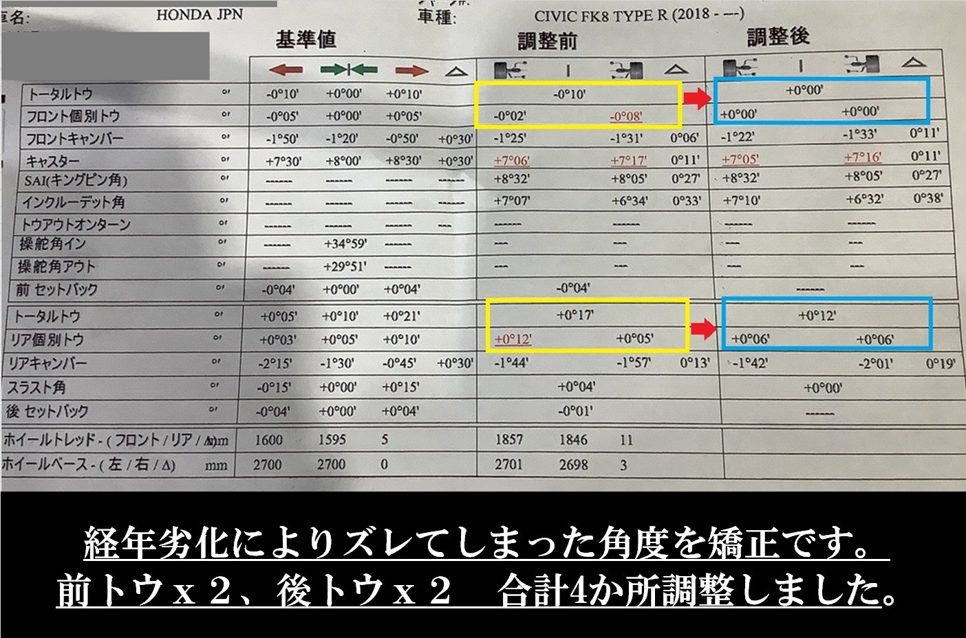 ホンダ シビック タイプR 6BA-FK8 アライメント