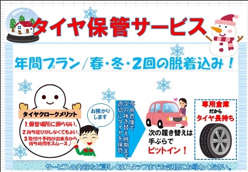 タイヤクロークサービス ポスト タイヤの置き場所にはお困りではないでしょうか? 当店では、タイヤお預かりサービス(タイヤ保管)を行っております! 置き場所がないとか、タイヤの持ち運びが大変とか 盗難が心配などなど、、、、、 タイヤお預かりサービスをすることで、タイヤ交換のご予約もできますし 当店にて空気圧チェックや、残り溝のチャックもさせていただきますので、 タイヤのメンテナンスもバッチリ☆彡 【年間プラン】 春・冬 2回のタイヤ交換込み! 一部アルミホイールはお預かりできない場合もありますので、 ご了承のほどよろしくお願いいたします。 金額などのお問い合わせは、スタッフまで(^^♪ カテゴリ:商品情報 その他商品・サービス