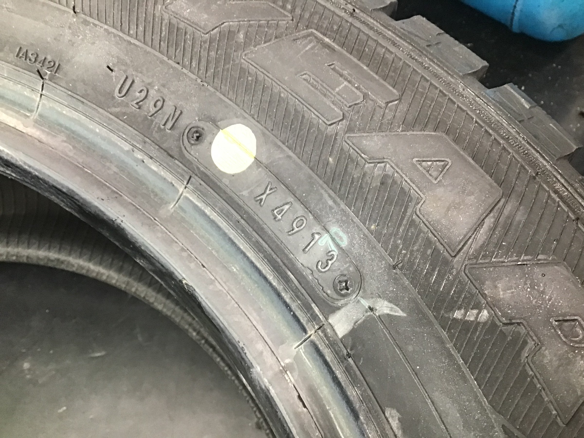 2013年のスタッドレスタイヤでした!9年前のタイヤで新品のようなタイヤでしたが、経年劣化によってゴムが固くなっており、このまま装着してしまうと危険だった為、新品スタッドレスタイヤへの交換をお客様に打診致しました。