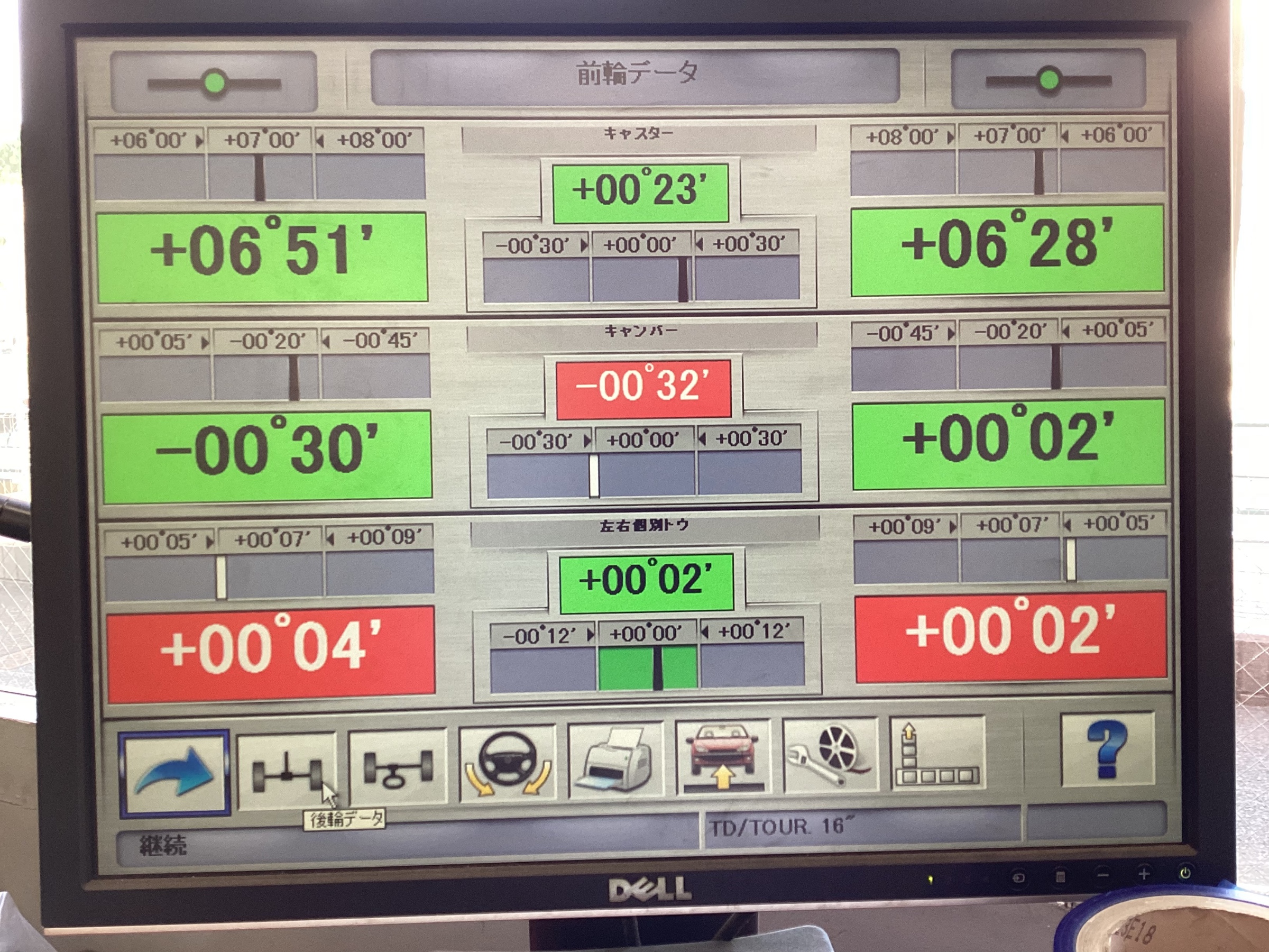 このように、タイヤの取付角度を細かい数値で測定、調整していきます。