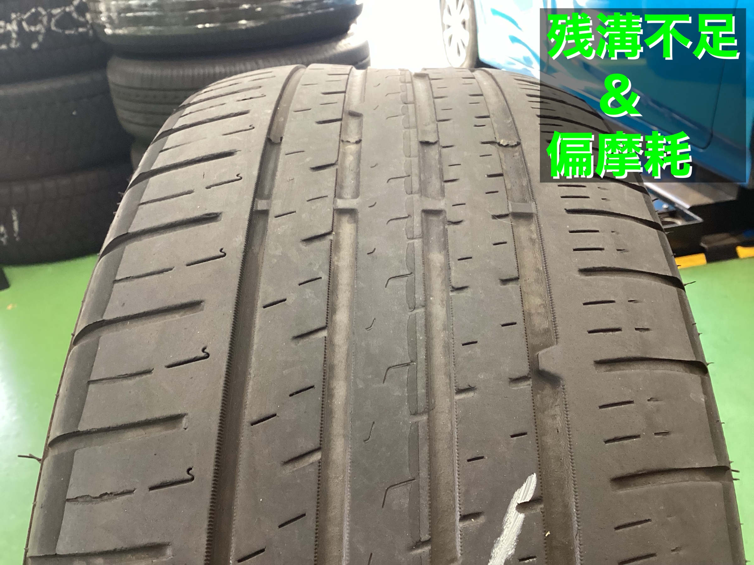 残り溝が少なく、生ゴムが見えて危険な状態でした。偏摩耗も見られます。