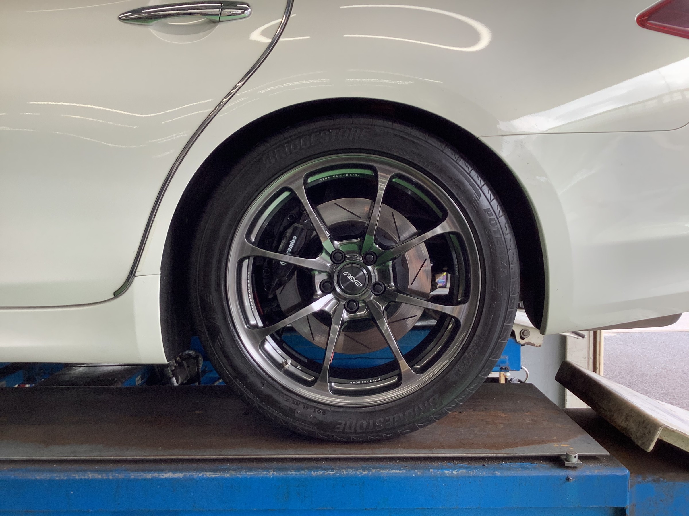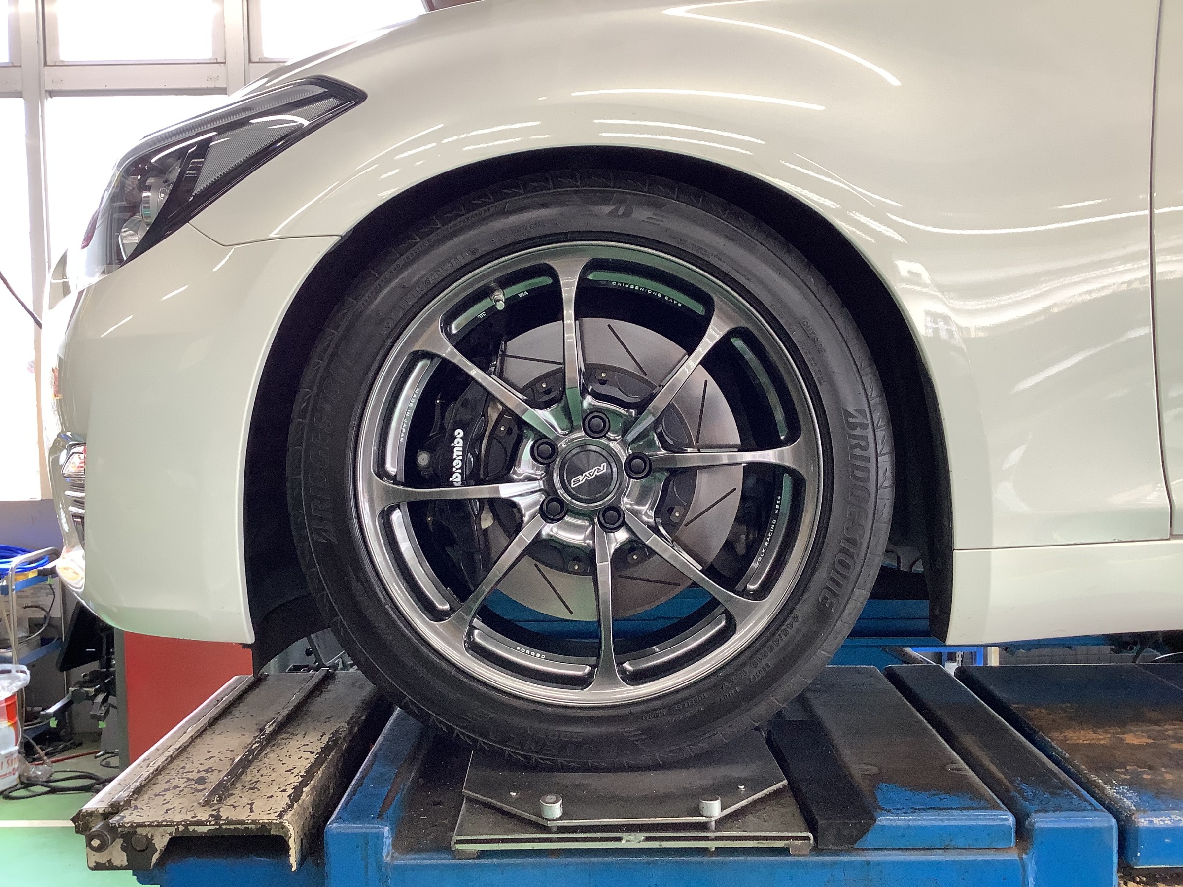 このお車はブレンボキャリパーが装着されており、ボルクレーシングNE24ならこのビッグキャリパーも難なく逃がします♪
