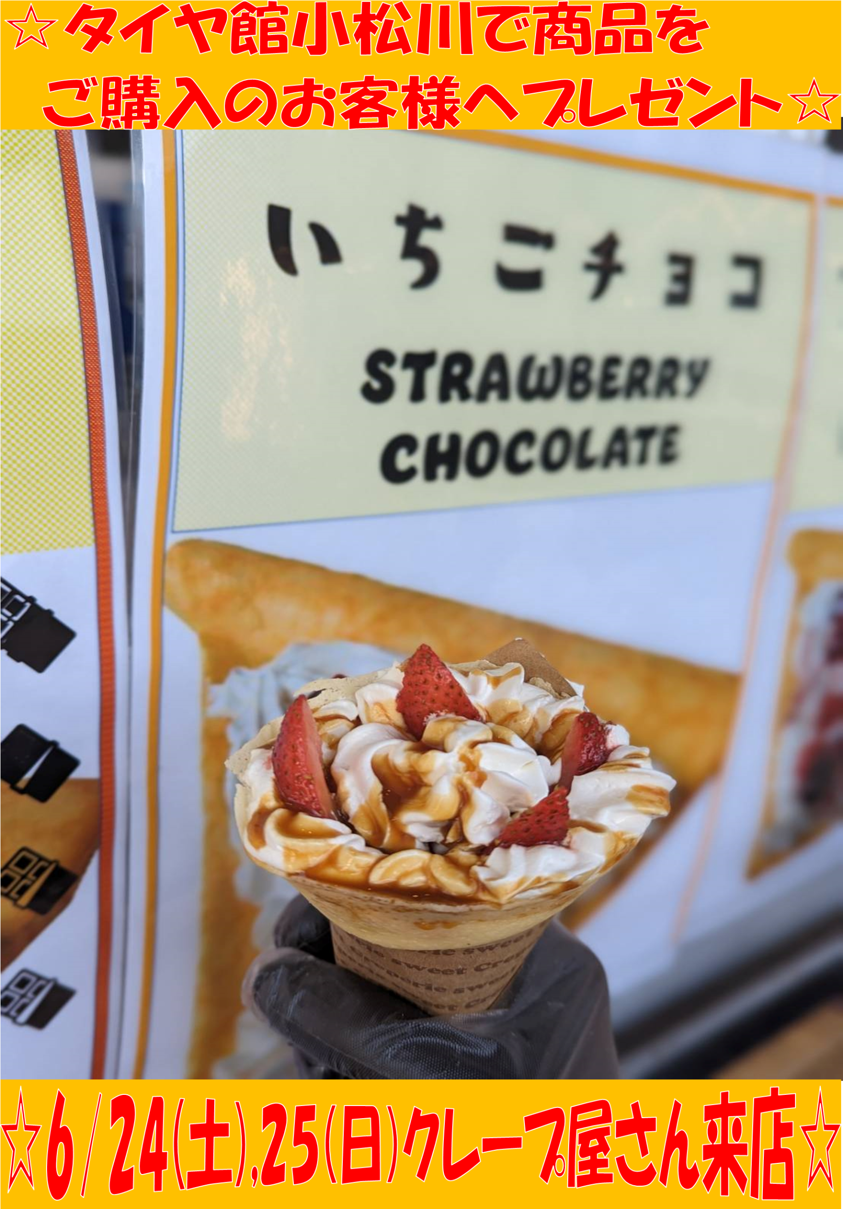 期間内にタイヤ館小松川店で商品ご購入のお客様へ、クレープをプレゼント♪