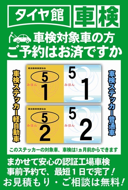 ☆タイヤ館小松川店 車検受付中です! ポスト 2023年9月9日 タイヤ館小松川では、提携している指定工場にて車検を受けられます! 満了日は把握されてますか? お見積もりはタイヤ館小松川にご来店いただければOK! ☆代車ご用意可能です! ☆全額クレジットカードでのお支払い可能です! ☆もちろんタイヤ交換や各種メンテナンスもお任せください! お問合せはタイヤ館小松川へお気軽にどうぞ! 03-5607-7671 ※お問い合わせへは営業時間内での対応となります。 あらかじめご了承ください。 カテゴリ:お知らせ