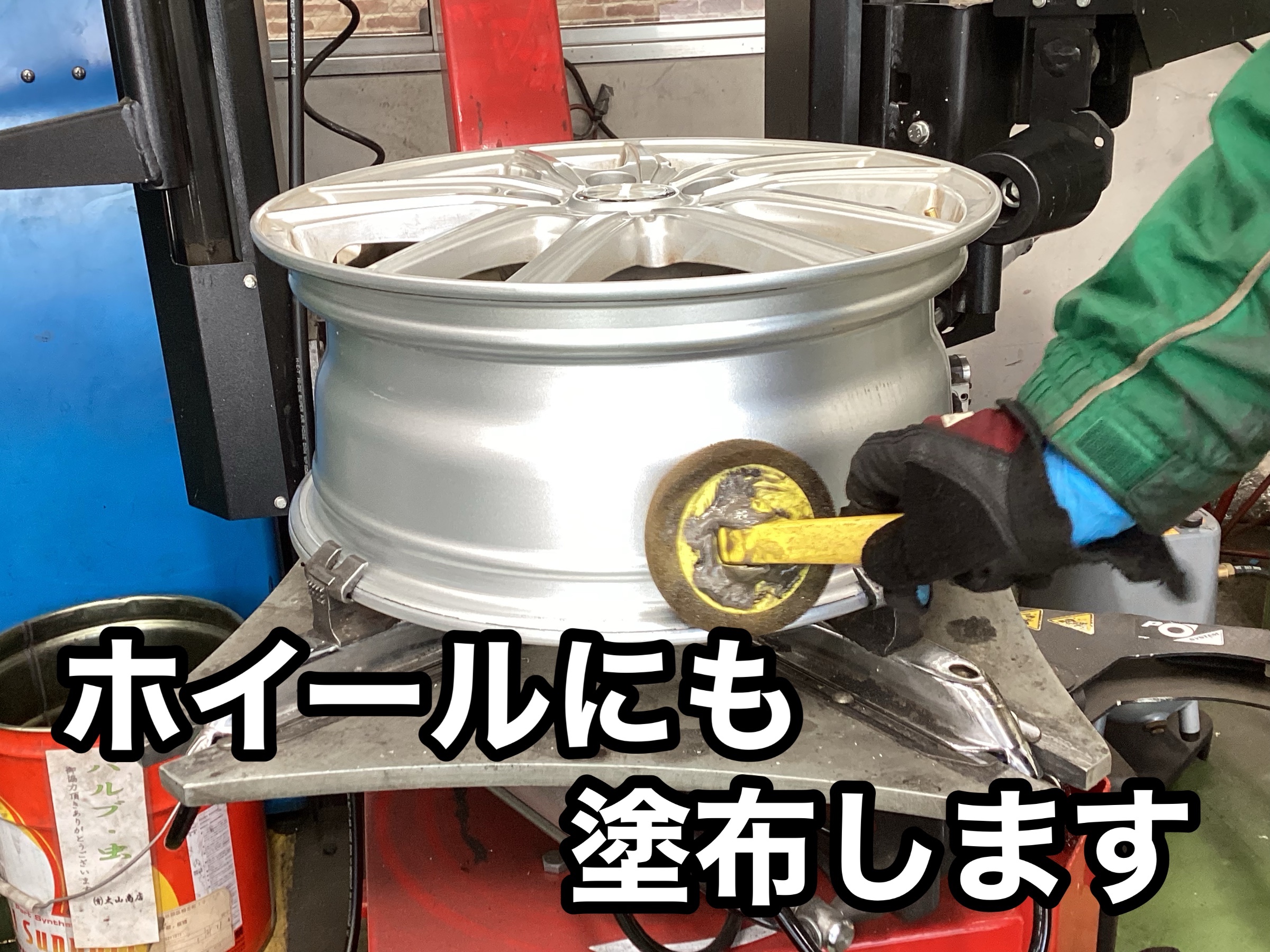 万が一にもタイヤを損傷させてはいけないので、全作業しっかり塗っています。
