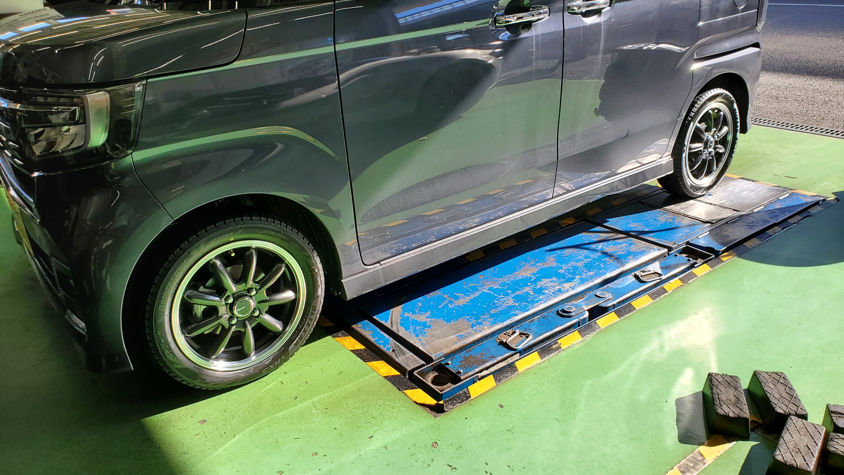 本日はN-BOXカスタムにスタッドレスタイヤを装着しました。