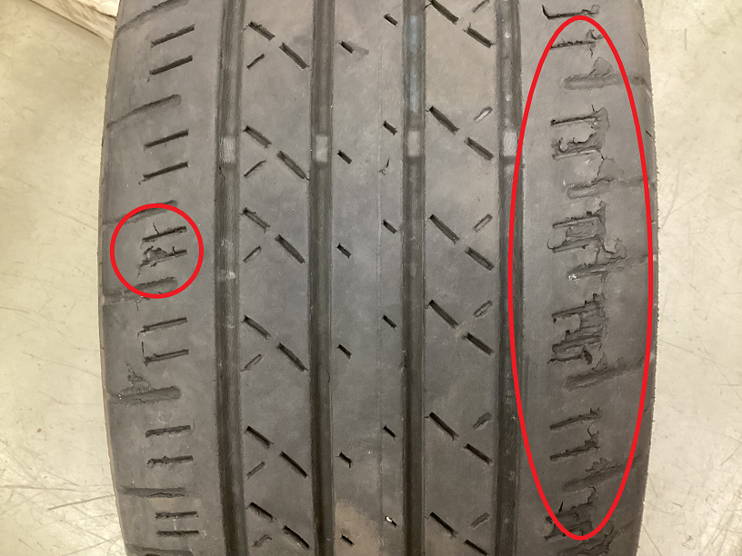 チッピング摩耗:タイヤのトレッド面の一部分が剝がれてしまう現象