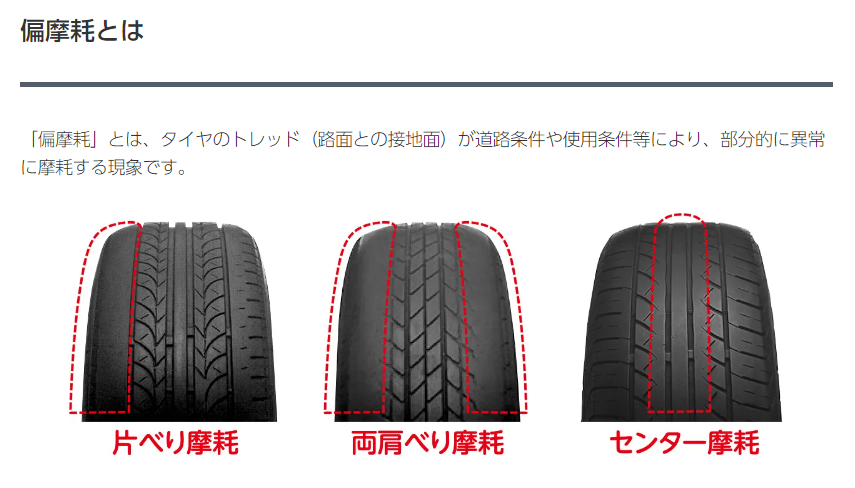 片側偏摩耗:タイヤのトレッド面の片側だけが減ってしまう現象