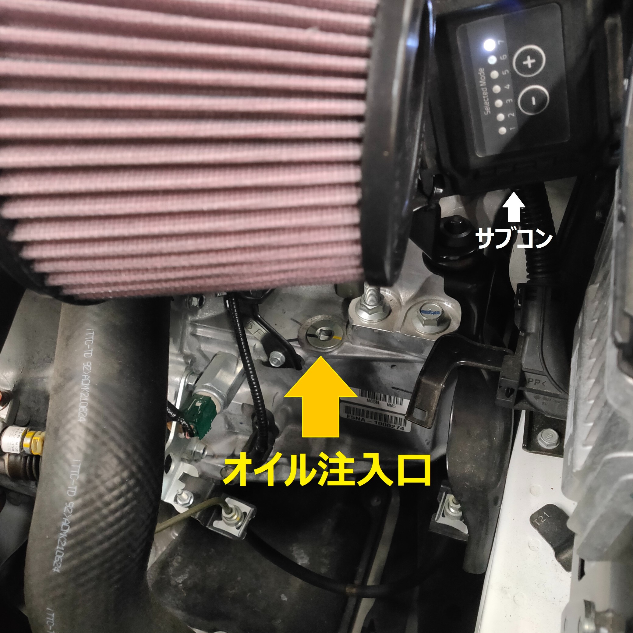 ミッションギアオイルの注入口は、珍しく上にあります!