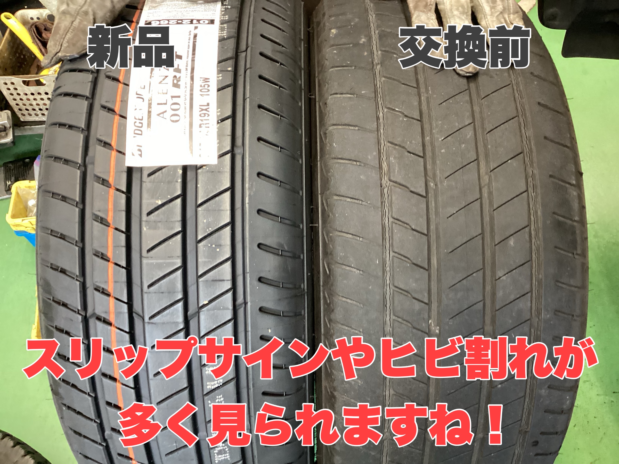 当店で点検させていただいたところ残溝が少なくなっており、トレッド面のヒビ割れも進んでいたため交換という運びとなりました!