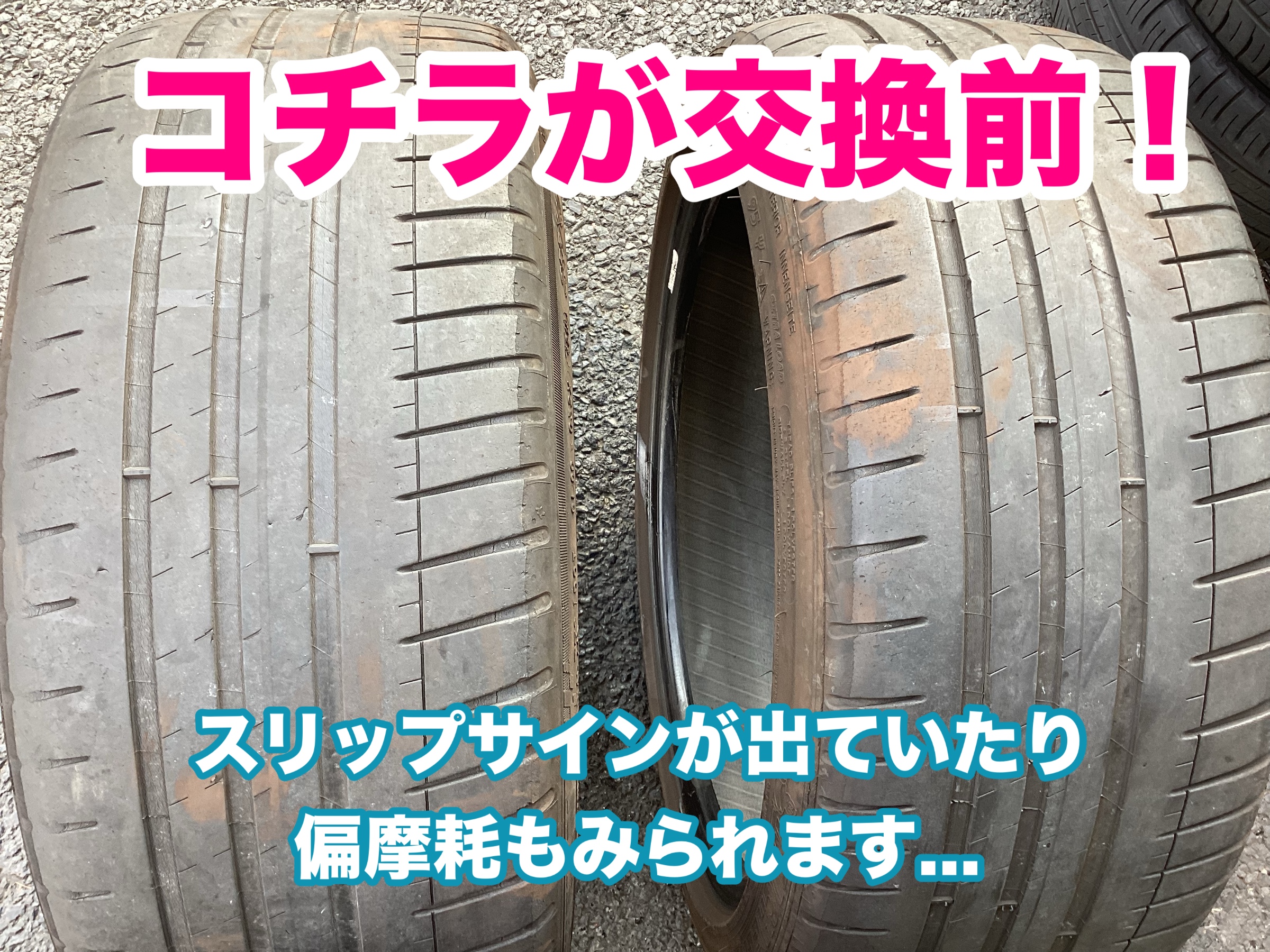 上の写真は交換前のものなのですが、山が減ってスリップサインが出てしまい偏摩耗もみられますね!