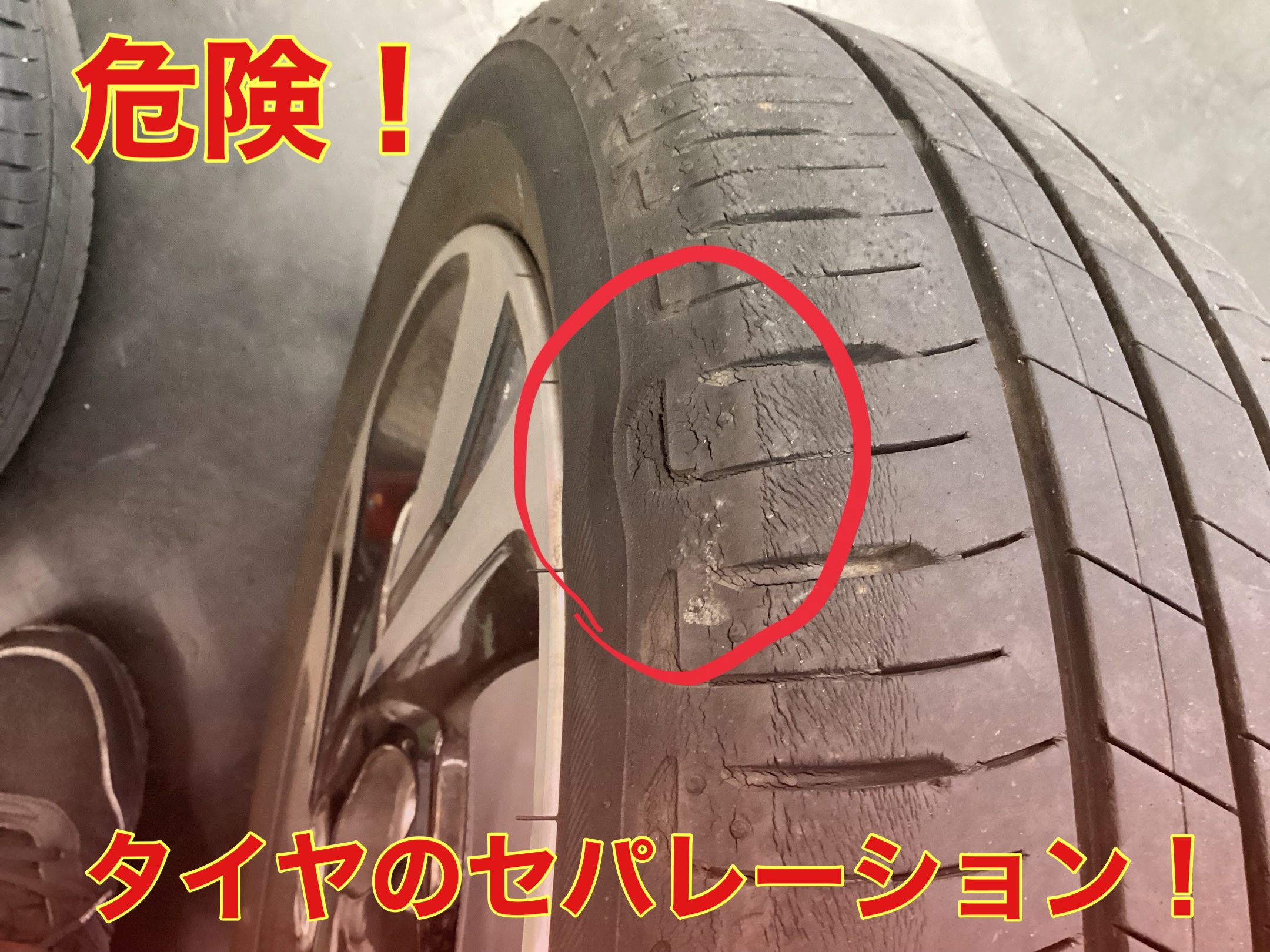 画像のように膨らみ、形が歪になっているのがセパレーションを起こしたタイヤです。