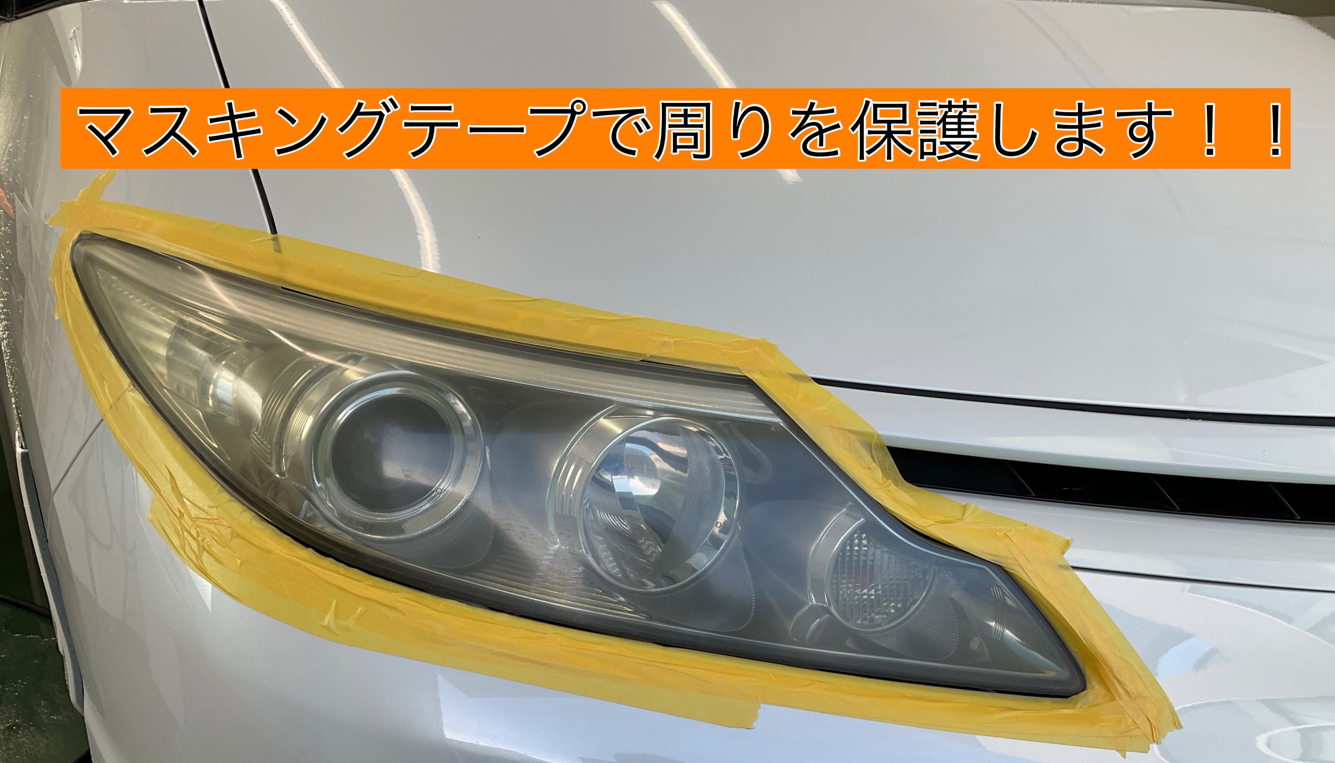 ヘッドライトの施工をする前に、マスキングテープで周りを保護します。