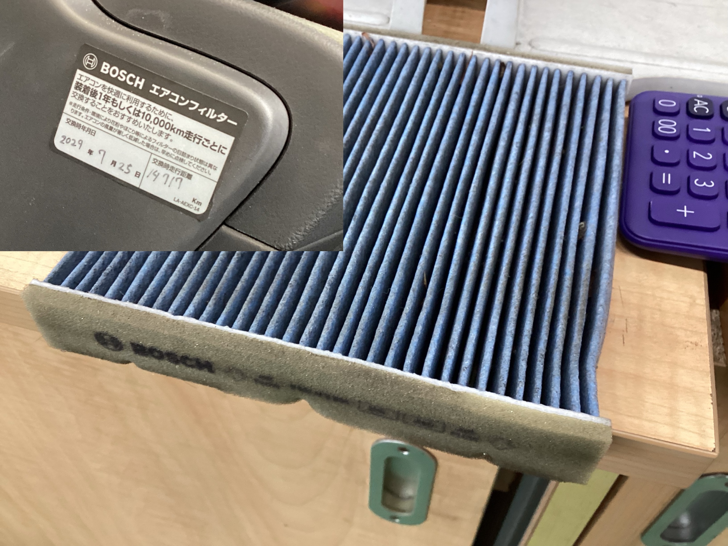 これはスタッフの車のエアコンフィルターなのですが、ものすごく汚いですよね