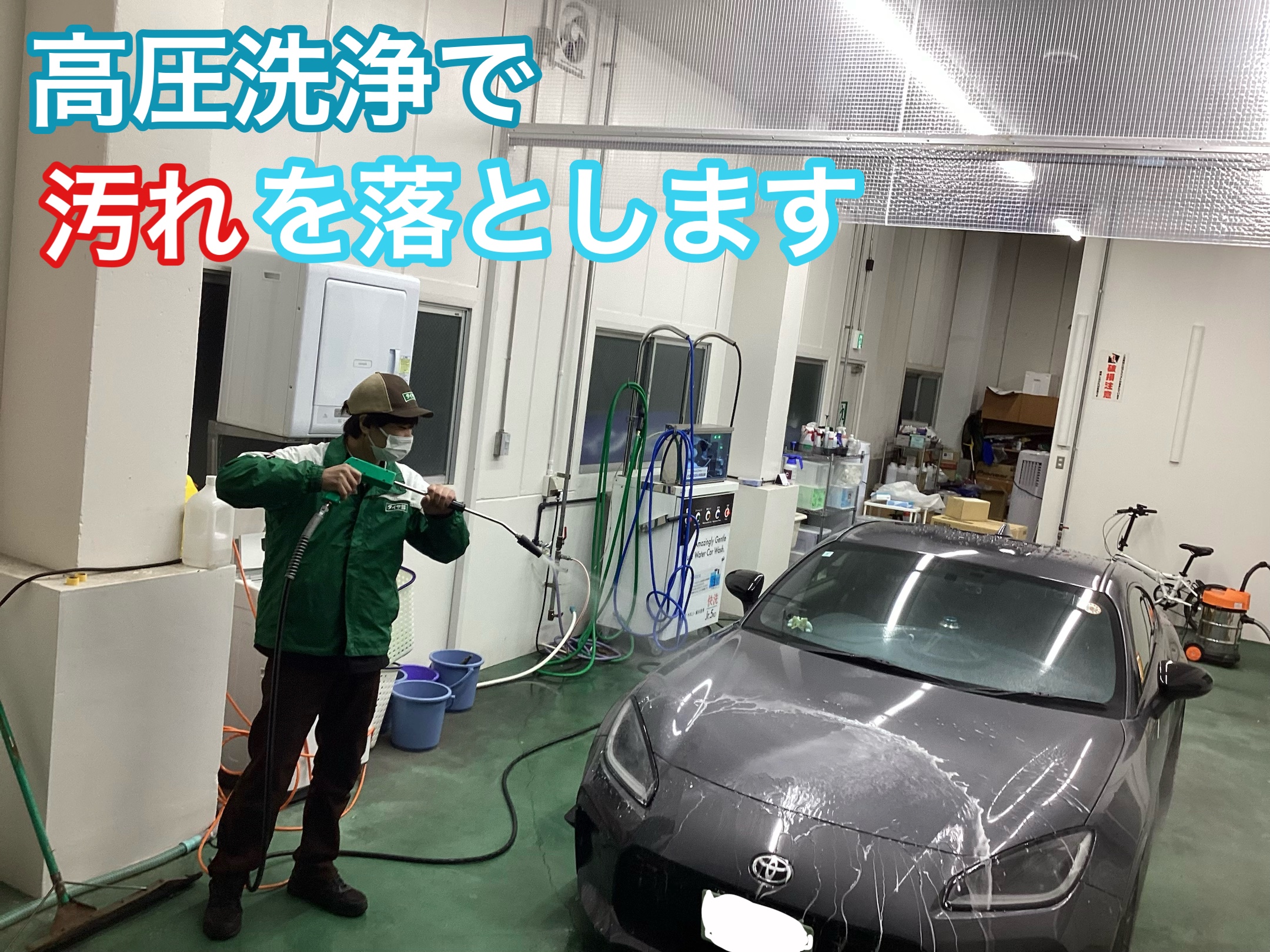 高圧洗浄で付着したホコリやゴミを大まかに落としてから、泡で優しく手洗いします。