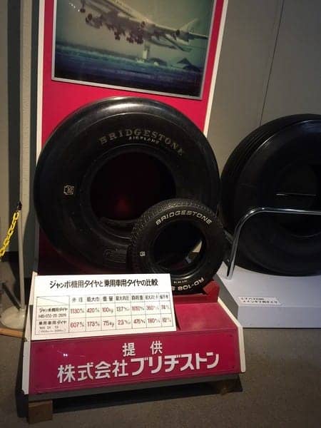 飛行機のタイヤと乗用車のタイヤの比較が飾ってあって、
