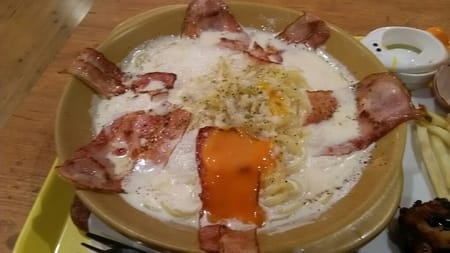 私はおススメのはみ出しベーコンカルボナーラを食べました!!