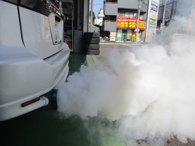施工中に空ぶかしをする行程があるのですが、ふかすとこのように白い煙が出て悪い物質と一緒に燃やしてるのがよ~く分かります♪