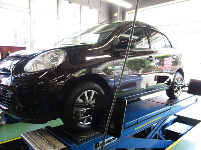 次は、日産 マーチです!! タイヤをレグノGR-XIに交換し、アライメント調整を実地しました!!