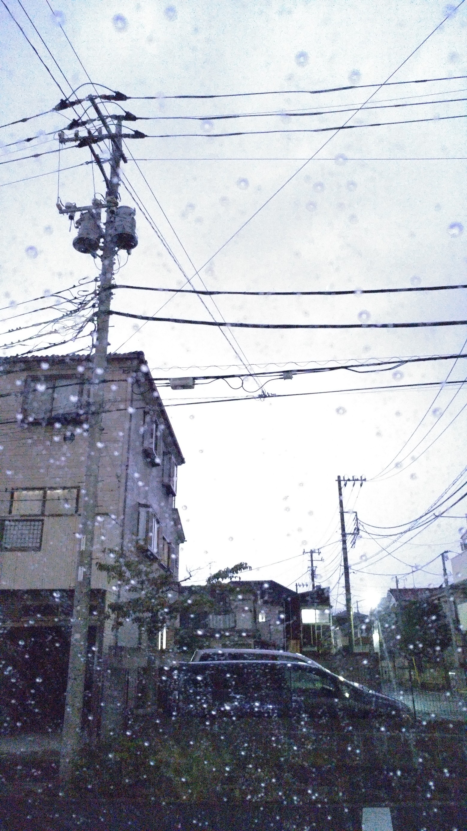 車庫に着いた途端に「ゴロゴロ~!!ドシャーーー!」 ※空が白いのは雷です