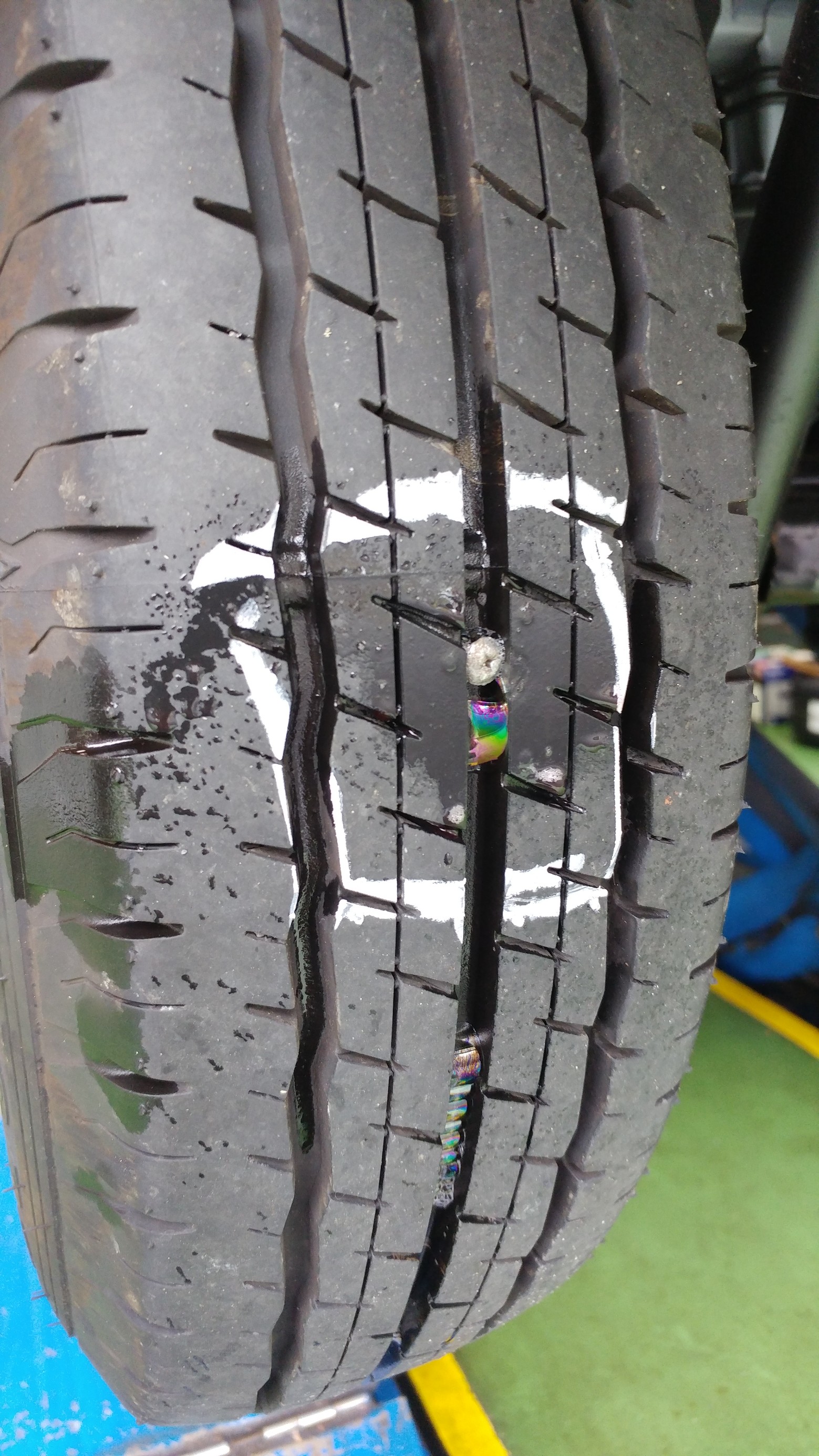 このようにネジがささり、空気が抜け出てますね。このように、どこになにが刺さるかわからないのでちょっとでも変だな?いつもと違う違和感があれば早めに点検を!