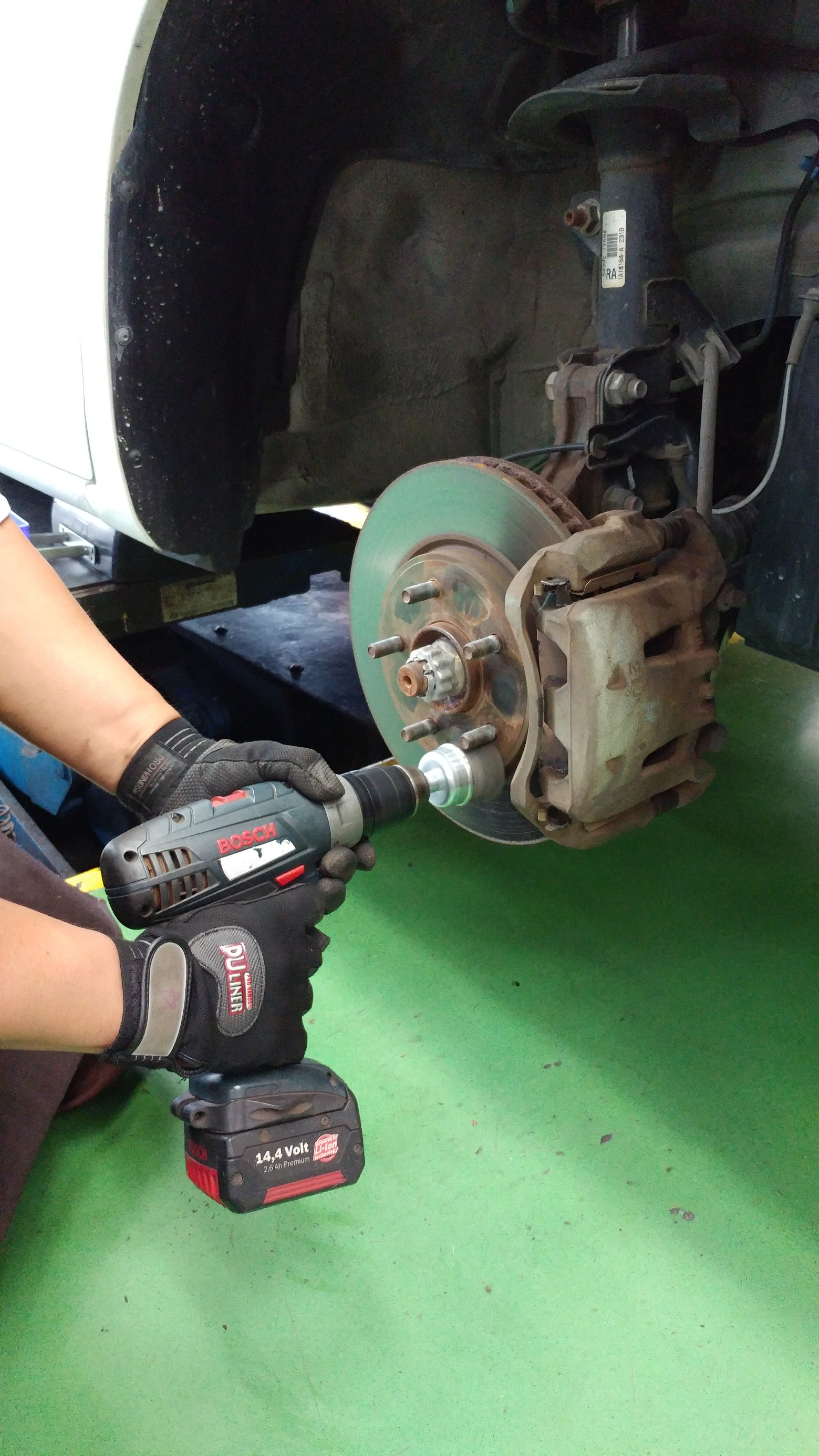 ハブボルト周辺をブラシで磨き、化学反応によって金属を錆から守る作業です!