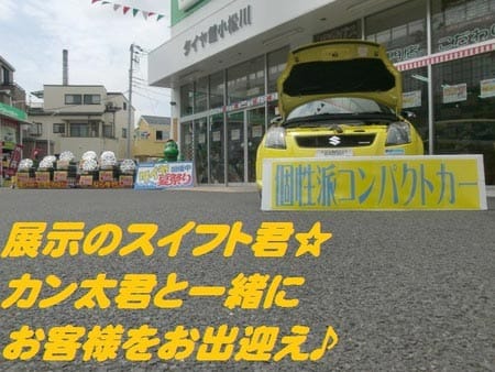 店頭に展示している『個性派コンパクトカー』のスイフト君も