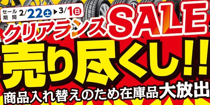 クリアランスセール 開催します! ポスト 2020年2月20日 開催期間:2020年2月22日~2020年3月1日 今週の土曜日からクリアランスセールを開催致します! 当店に在庫してある 夏・冬 タイヤの在庫一掃セールです! 在庫限定商品もございますので、この機会をお見逃しなく!!! カテゴリ:お知らせ