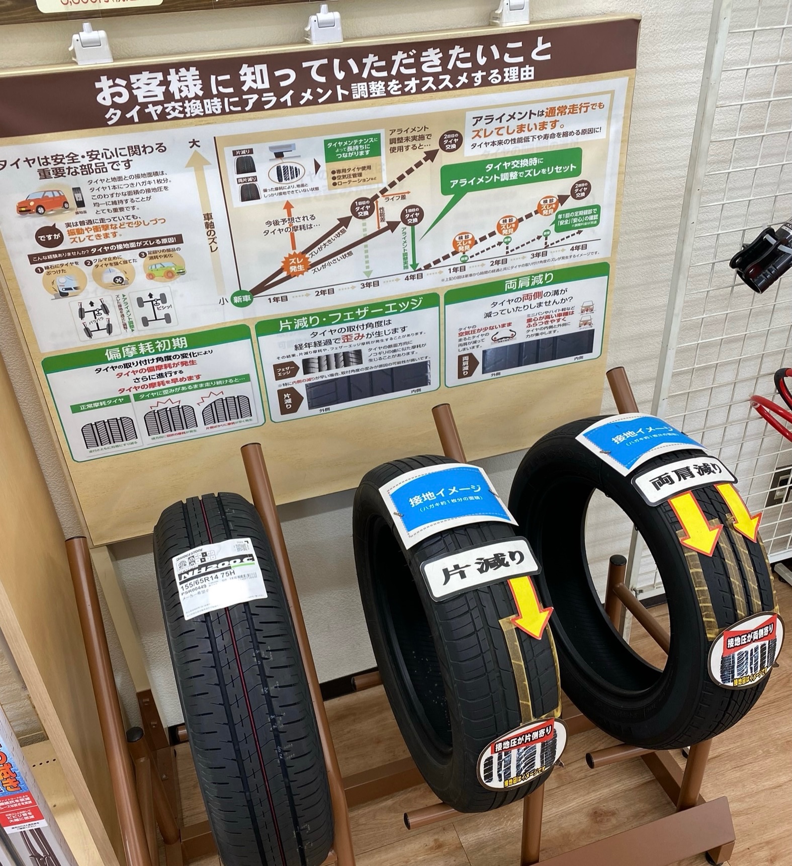 タイヤの取り付け角度を調整する「アライメント調整」もおすすめさせていただいております!