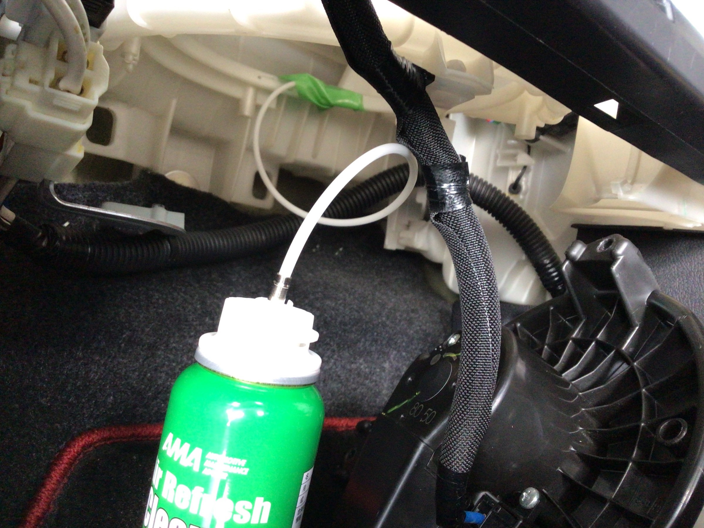 車種にもよりますが、助手席の足元にあるブロアモータを外して施工します!
