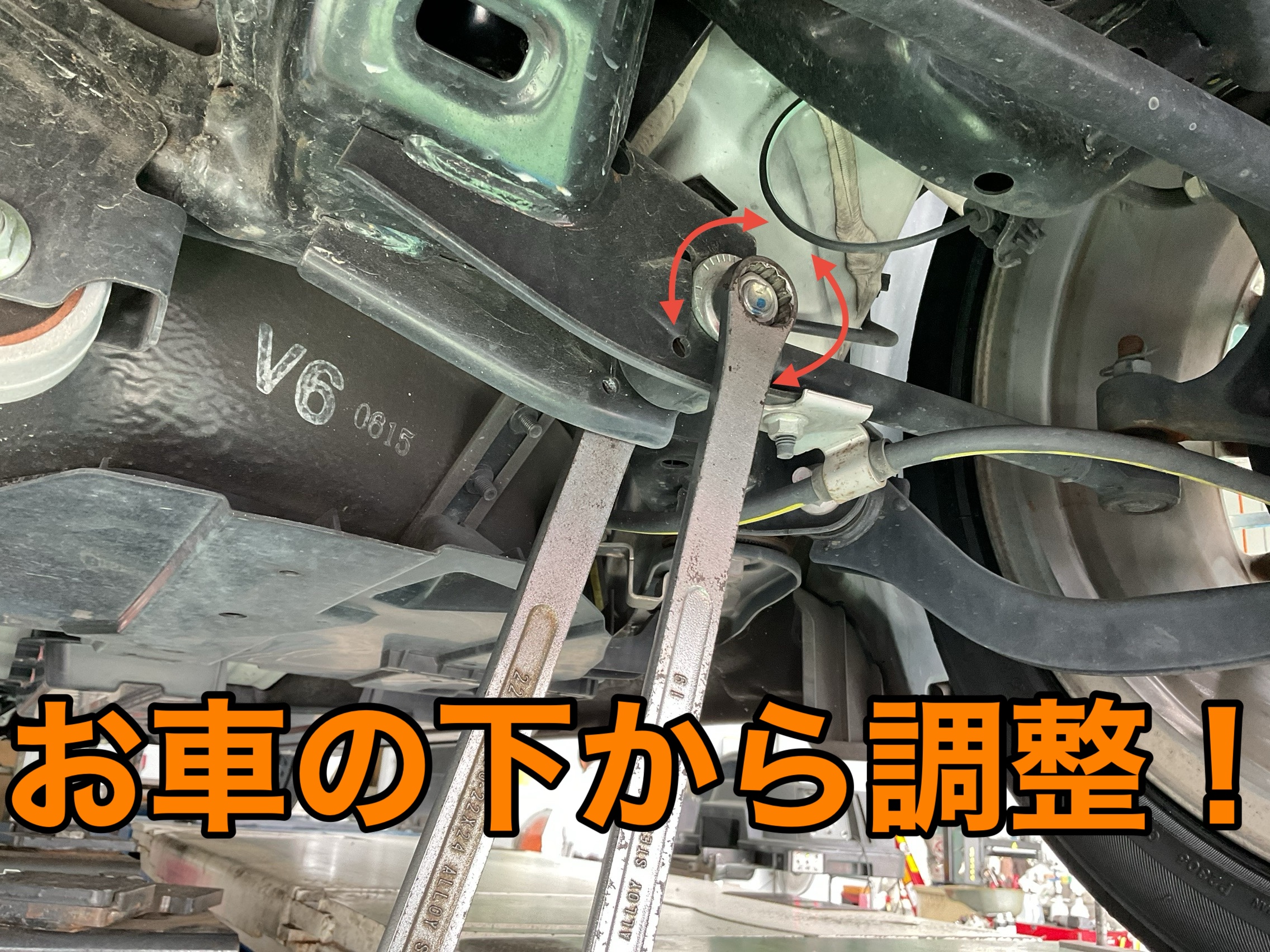 新しいタイヤになるタイミングなので、タイヤの取り付け角度(アライメント)の