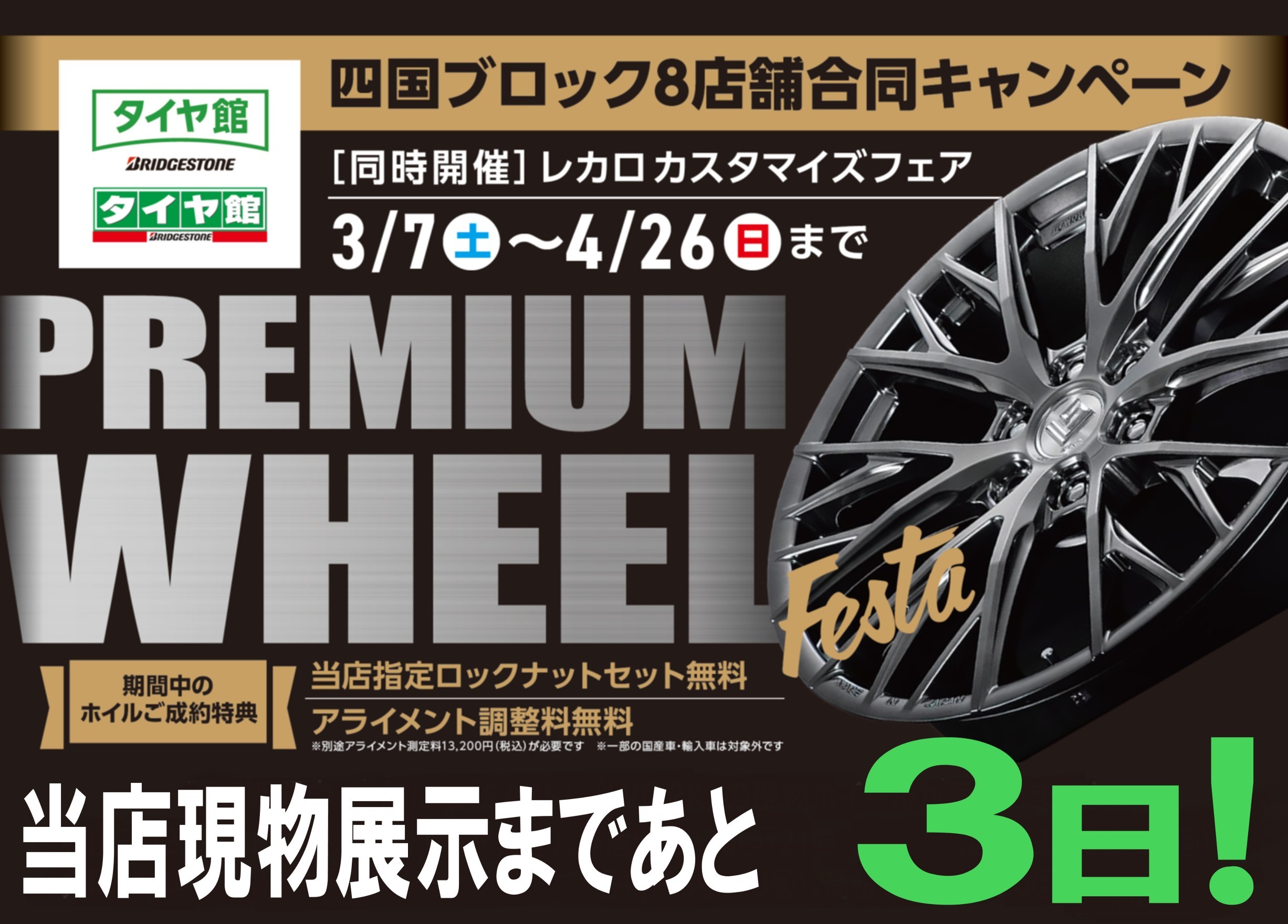 残り3日!! タイヤ館小松島店での展示は4/11(土)、4/12(日)の2日間です!! 半期に一度のビッグイベント!【PREMIUM WHEEL Festa】開催!! 愛媛県・香川県・徳島県のタイヤ館が結集したイベントです♪アナタだけのカスタムを全力応援します♪