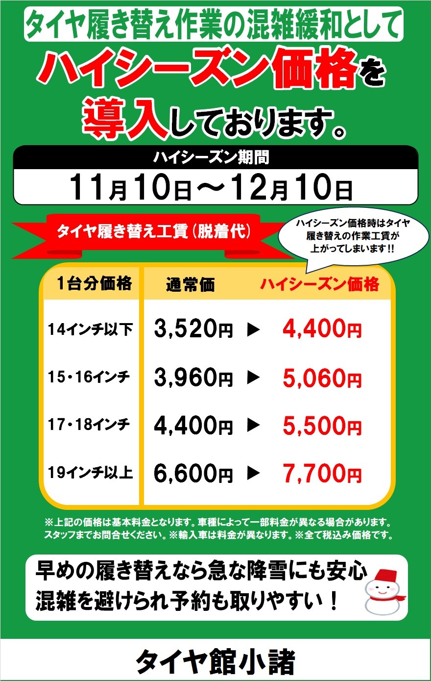 履き替え工賃のハイシーズン価格が11/10から始まります