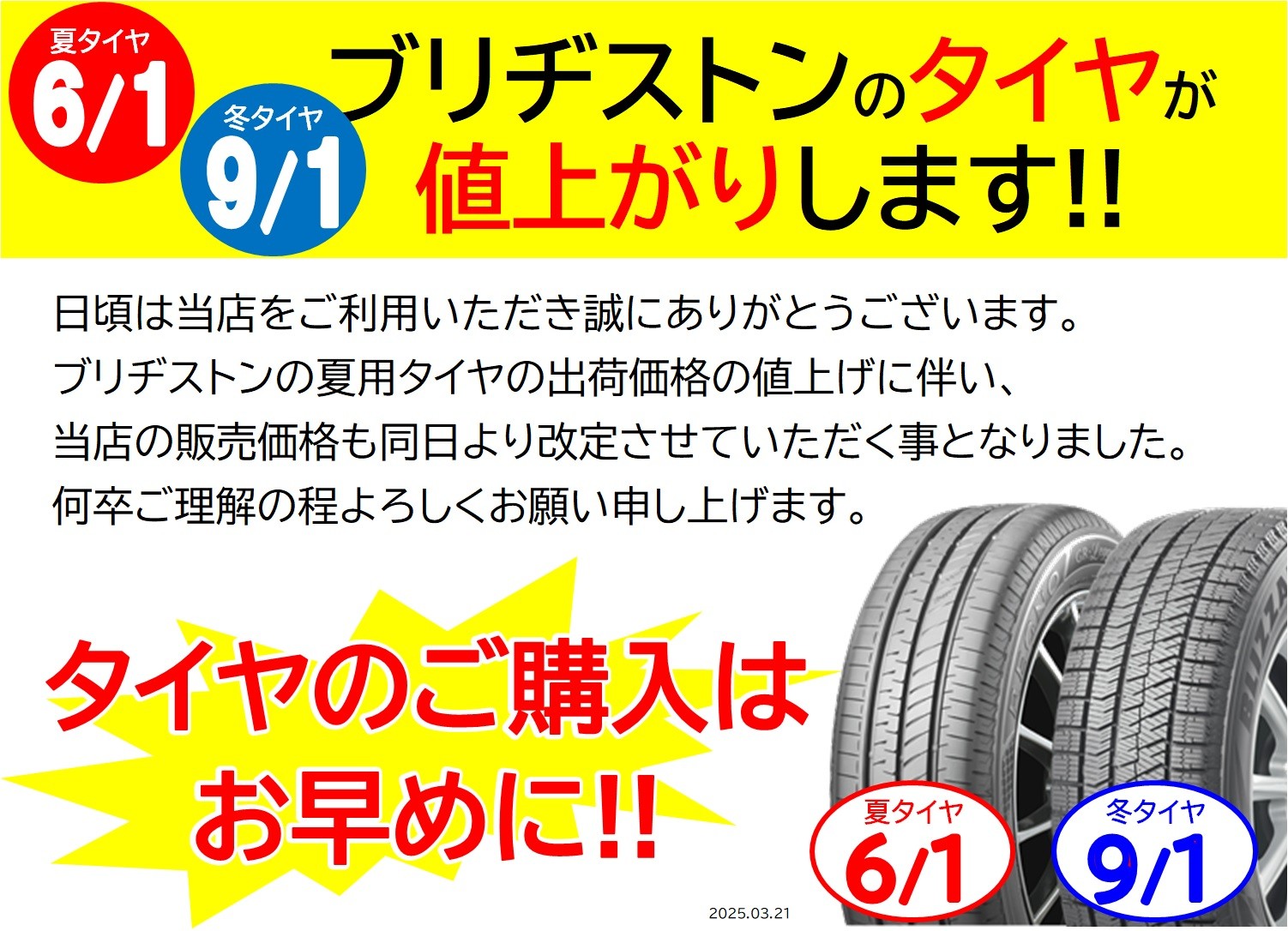 皆さま、こんにちは。 ニュース速報です。 2025年3月21日に株式会社ブリヂストンより 発表がありました。 国内市販用タイヤのメーカー出荷価格の値上げ が決定いたしました。 詳しくは下記ブリヂストンサイトで ご確認ください。 【ブリヂストンニュースリリース】 購入を検討されている方は お早め...