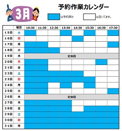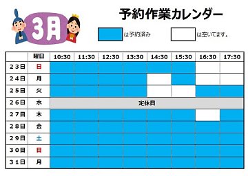 皆さま、こんにちは 週末から19日㈬頃までは、 寒波の影響で気温はもちろん雪予報も 出ておりますが、 春の準備は今がおススメです。 春の履き替え予約が取りやすい今、 ご予約の相談にはおススメ時期です。 下記の予約状況をご参考に 検討してください。 4月の予約状況です。 定休日や営業時間外で...