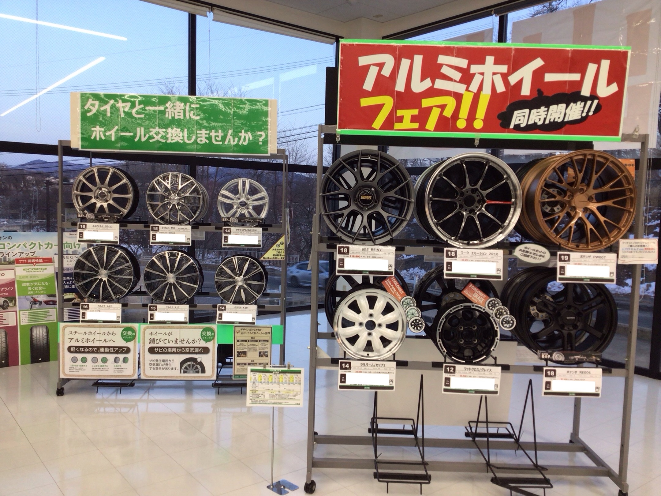 こんにちは。 春のスーパータイヤセールと同時に アルミホイールフェアを開催しております!! なかなか現物を、見ることができないポテンザや BBSなど有名ホイールを多数展示してあります。 買うか悩んでいる方や見てみたい方 写真ではわからないかっこよさがありますので 空気圧点検の際やノーマ...