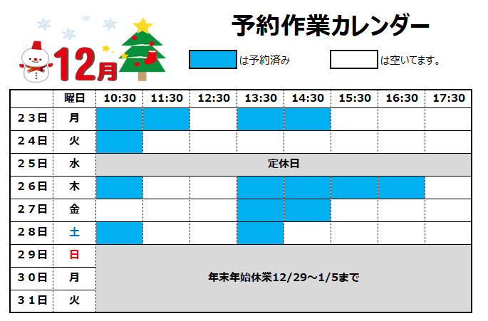 皆さま、こんにちは。 今年最後の予約状況更新となりました。 すでに履き替えなどの混雑は 落ち着いております。 予約外でも、お待ちいただきながらの 作業も同時に実施しております。 予約も空いておりますので オイル交換等もご利用ください! 定休日や営業時間外では、 WEB作業予約をご活用くだ...