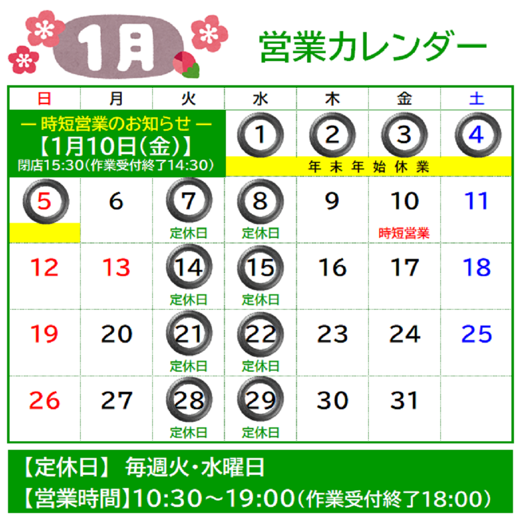 皆さま、こんにちは 12月は定休日が水曜のみでしたが、 1月〜2月までの期間は、 定休日が毎週火曜、水曜定休となります。 ご来店の際はご注意ください。 営業時間は10:30〜19:00です。 年末年始連休明けのメンテナンスに ご来店ください。 お待ちしております!