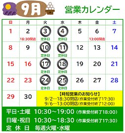 9/17(火)18(水)は定休日です。