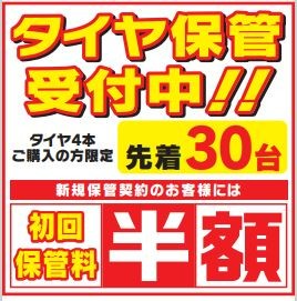 皆さま、こんにちは 8/23より「夏タイヤ売り尽くしセール」開催中ですが、 セール期間中 タイヤ4本ご購入及びご予約いただいた お客様限定で タイヤのメンテナンス保管料を半額で 受付しております。 保管場所の関係で限定30台となりますが、 引っ越して来て冬タイヤが必要になるお客様や クルマを...