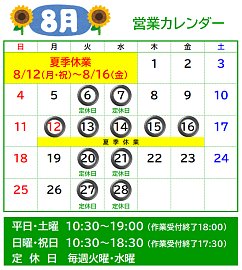 いつご覧いただきありがとうございます。 8月も今週で最後となります。 9月までは毎週火曜、水曜が定休日となっております。 お間違えなきようご来店ください。 店舗が休みの日でも、WEBから作業予約ができるので ご活用ください!