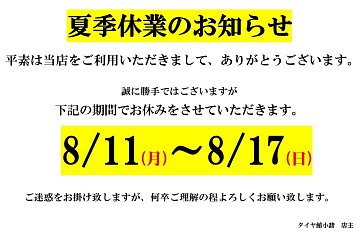 こんにちは 今日は8/10(日)ですが すでにお盆休みに突入しているお客様や お出かけ前にタイヤ交換したいと ご来店いただくお客様もいらっしゃいました。 たくさんのお客様にご利用いただき ありがとうございます。 当店は8/11より8/17までお休みを いただく形になりますので ご来店の際はお間違...