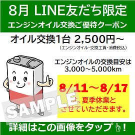 こんにちは! 8月のLINEクーポンは 「エンジンオイル交換」です。 夏季休暇でのお出かけや帰省などで 大活躍する愛車のエンジンオイルを お得に交換できるクーポンです! しかも!8/31までのセール期間中は オイル以外のメンテナンス品も 20%OFFキャンペーン期間なので 心配な部分があれば この機...