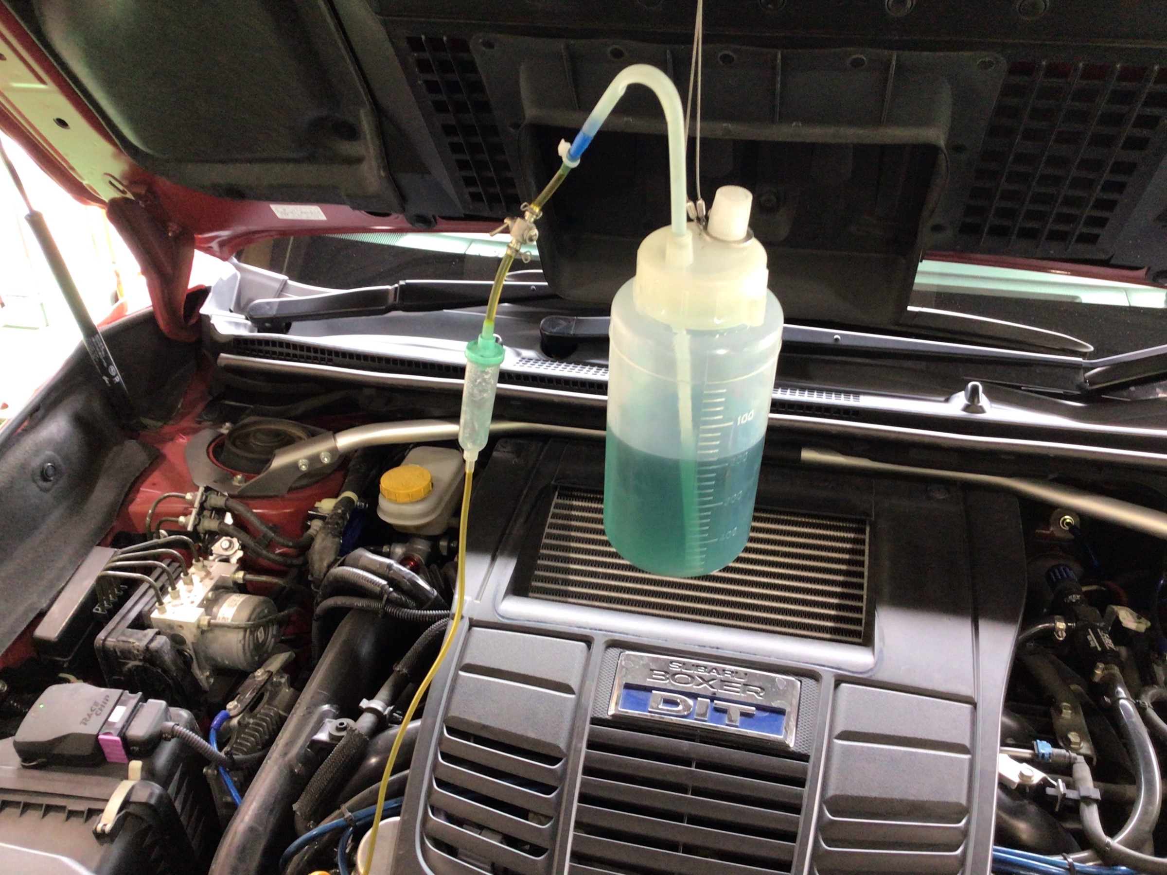 まず、エンジンルーム内部にある吸気系ホースへ繋げ、洗浄液を点滴の様に入れていきます。