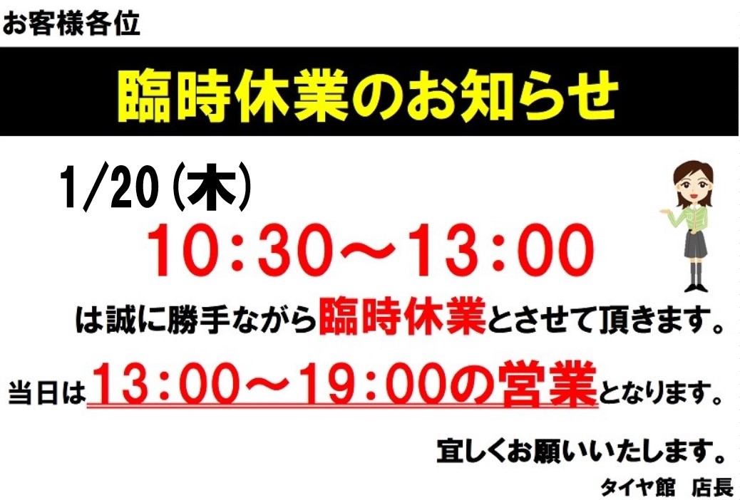 臨時休業のお知らせ ポスト 2022年1月14日 江南市・扶桑町・犬山市・大口町近隣皆様 タイヤ館江南店です。 1月20日 木曜日午前中 は誠に勝手ながら 社員研修の為 臨時休業とさせて頂きます。 営業は13時からになります。 ご迷惑おかけしますがよろしくお願いします。 カテゴリ:お知らせ