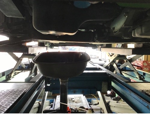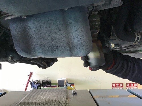 車両をリフトアップさせ、古いエンジンオイルを