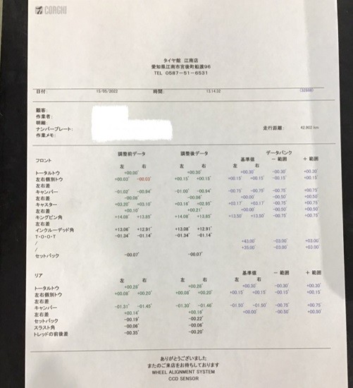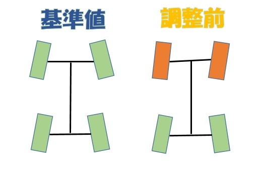 少し見にくいですが、左右フロントのトウが基準値からズレています